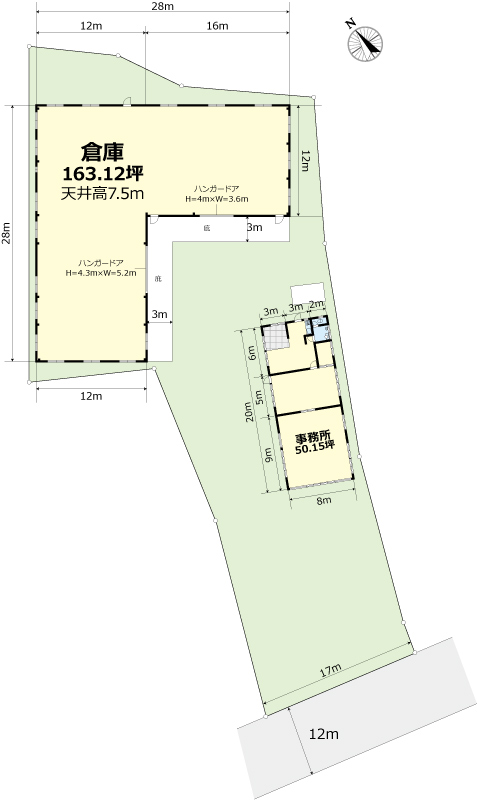 | 備考 | トイレ ハンガードア(H=4.3m×W=5.2m)1ヶ所(H=4m×W=3.6m)1ヶ所 天井高7.5m |