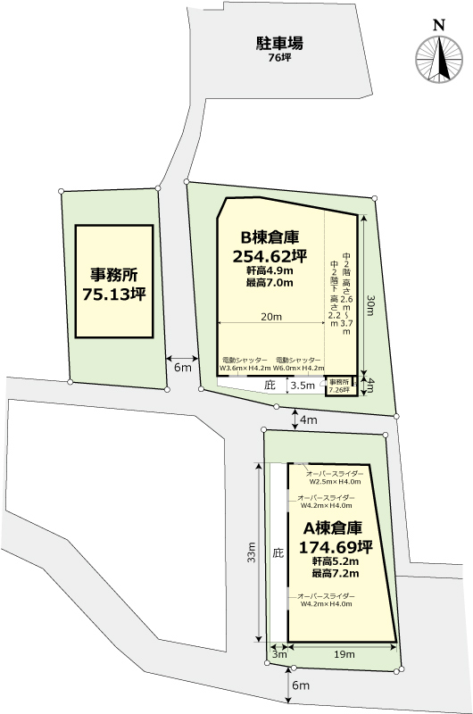 倉庫:A棟174.69坪 B棟254.62坪 事務所:75.13坪 |