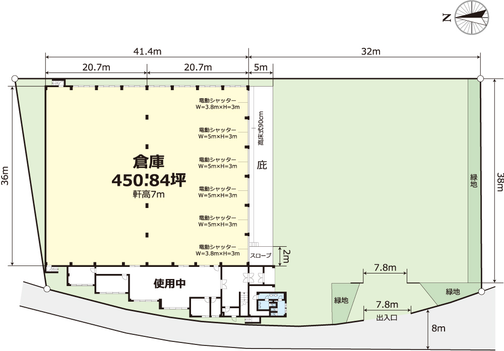 | 備考 | 高床式90cm 電動シャッター(W=5m×H=3m)4ヶ所 電動シャッター(W=3.8m×H=3m )2ヶ所 |
