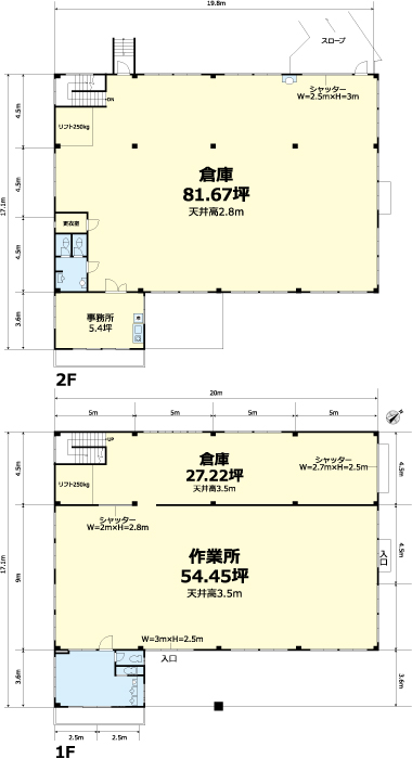 倉庫:1階:87.30坪 2階:87.06坪 |